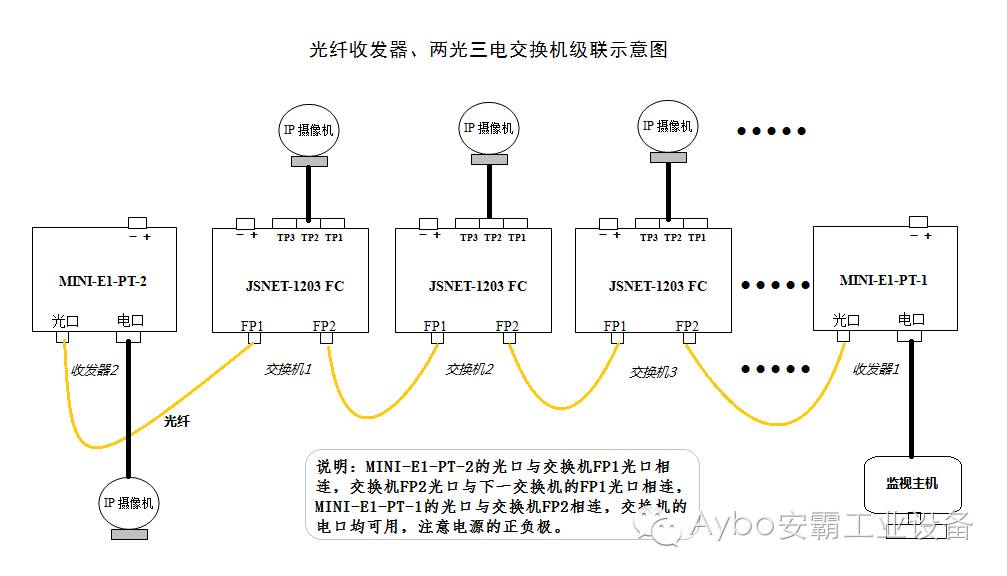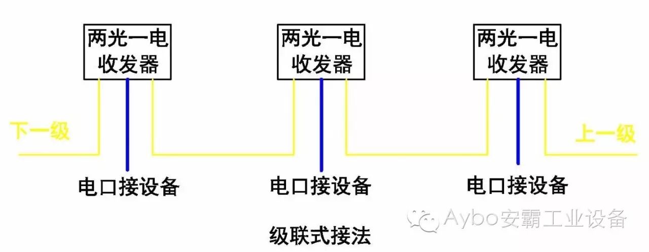 级联式接法是两光一电收发器最经典的使用方案,该方案是一种均分速率的通信方案,该方案可用于单线通信距离较远,可实现手拉手“接力赛”一样的环境中,比如:高速公路、城市安防、边防要塞、厂区周围之类的环境