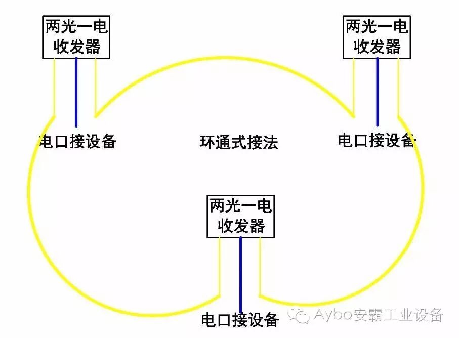 环通式接法是两光一电收发器在小范围组成环网应用的典型案例,该方案具有连环通信的特点,当某个点被切断或故障后,依然会保证通信不受影响。是厂区周界、闭锁防盗的最佳通信方案